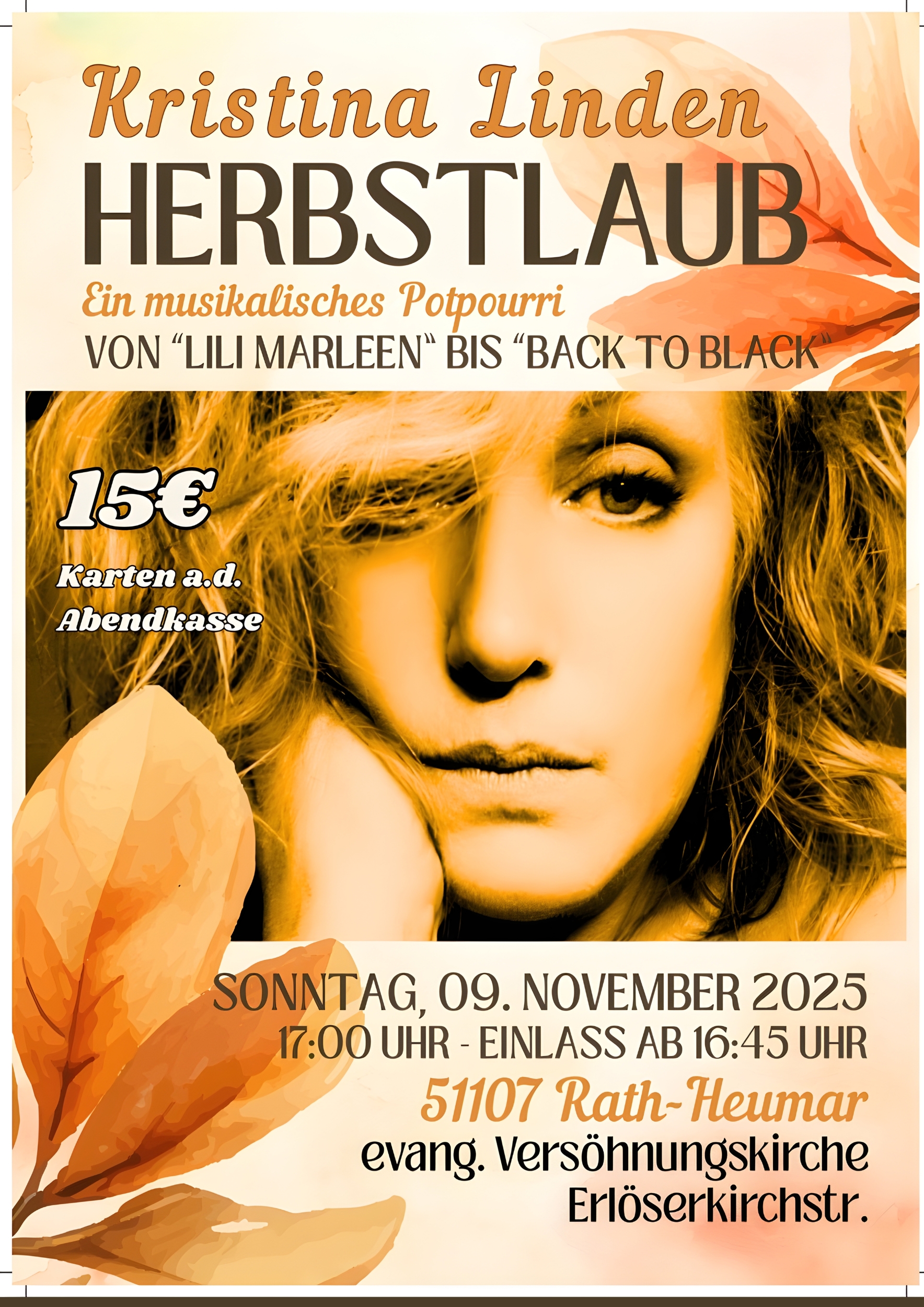 Herbstlaub - 2 Konzert „Herbstlaub“ am 9. November um 17.00 Uhr in der Versöhnungskirche mit Kristina Linden. Eintritt 15,00 € Das könnte dir auch gefallen Gruß zu Weihnachten und Jahreswechsel aus Ostheim 23. Dezember 2022 „Spuren im Schnee 11.0“ Weihnachtskonzert am 13. Dezember um 17.00 Uhr in der Versöhnungskirche 4. Dezember 2025 Tag 4 – Die Piraten sind los! 10. Juli 2024 Ein weiterer Tag im dänischen Paradies! 27. Juni 2023